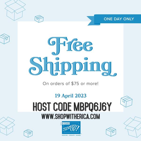 Hello everyone! Whoo hoo! Tomorrow, April 19th, Stampin Up is offering FREE SHIPPING on all orders over $75!