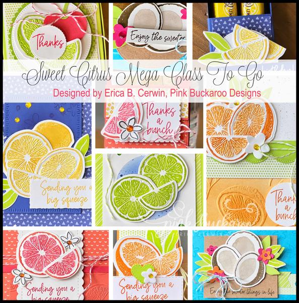 set is full of zesty image stamps and sweet sentiments to send well wishes to your favorite people. In this class, I have designed both a card and a treat/gift item using these stamps as a lemon, a lime, a grapefruit, an orange and a coconut! That’s ten projects in all- five cards, five treats! The treat projects coordinate with the cards so they can be given together if you