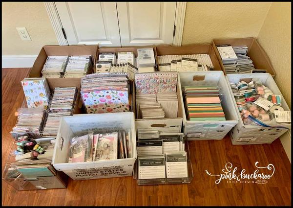 retried products. There are stamp sets, dies, punches, paper, embellishments, tools, ink, markers- plus a pack of handmade cards! My amazing assistant has taken weeks to organize my retired product and lovingly packed these boxes so that you will have so much fun with your new goodies. Check out some of it below! Â