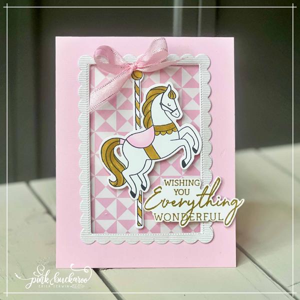 I've got three ADORABLE Carousel Horses projects to show you today. One of them is actually the swap I took to Norway. Above is a card I showed yesterday on my blog. Stop by here