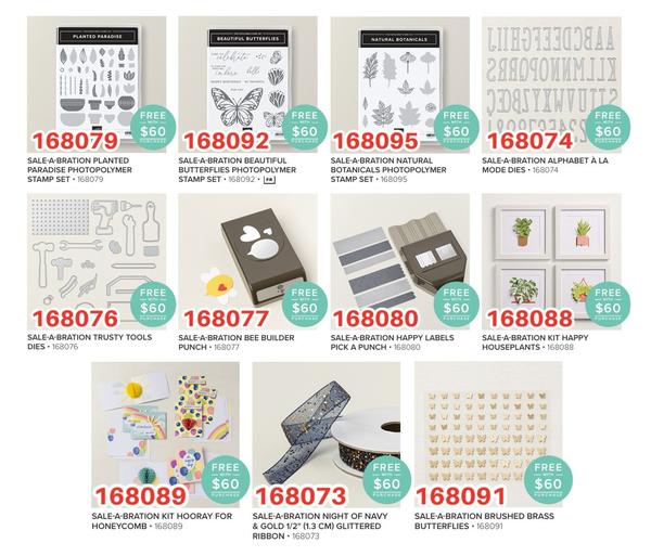 Stampin' Up added ELEVEN new items to their Sale A Bration offerings yesterday! All of the items shown above are free with a $60 purchase. Including the dies!! Those Alphabet A La Mode Dies are the best choice, in my opinion! Wow!