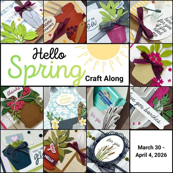 Let's bring Spring into our crafts with the Hello, Spring Craft Along! Join me and five of my talented friends as we make TWELVE spring projects! I'll be doing 6 days straight of videos and projects starting on March 30th featuring two projects each day!! Watch the videos on my Facebook page and YouTube. Enhance your experience by ordering a Craft Along package to be sent to you ahead of time with the supplies you'll need (no ink or stamps/bundles) AND all 12 Tutorials ahead of time so you can make them along with us!